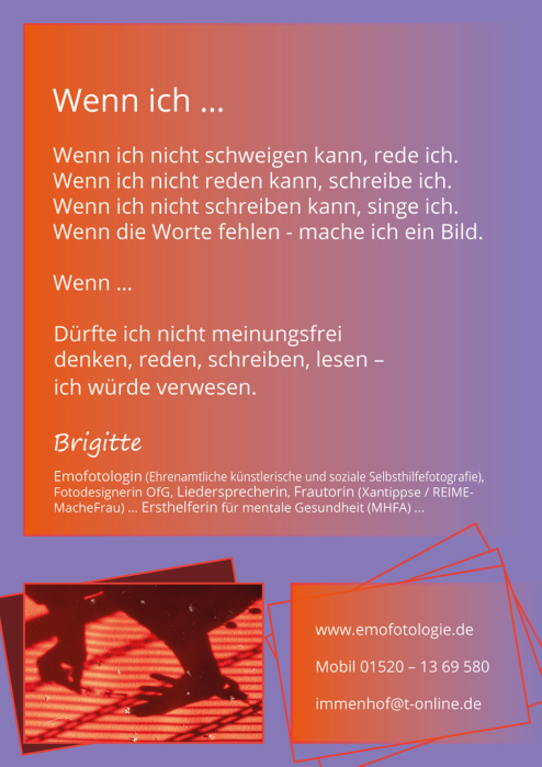 Wir sehen hin. Wir machen keine Fotos to go. Weil auch wir verantwortlich sind: Emofotologie (Ehrenamtliche Selbsthilfefotografie, sozialkritische Perspektiven, Wir-Projekte …) und Unser kleines Stadtatelier für kreative Inklusion. Unter der Verantwortung von Brigitte Schulz.