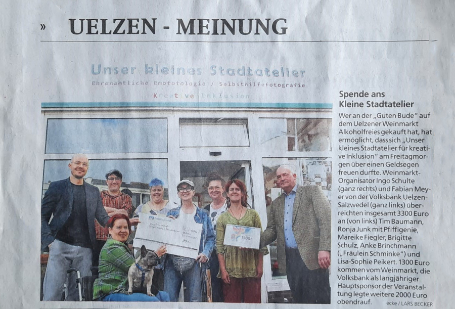 Sibylle Kollmeier steht seit rund 5 Jahren hinter uns. Anfangs als engagierte Frau, die an uns / unser Projekt geglaubt hat, heute auch als Atelierbotschafterin. Bis heute hat Sibylle uns unglaublich viel ermöglicht und auch andere dazu bewegt uns zu unterstützen. Mit der diesjährigen Benefizbude (alkoholfreie Getränke in der roten guten Bude) auf dem Uelzener Weinmarkt hat Sibylle 1.300 Euro für uns zusammen bekommen. Und die Volksbank hat noch 2.000 Euro draufgelegt. Damit können wir einige unserer Projektwünsche realisieren.